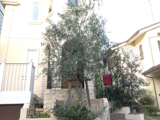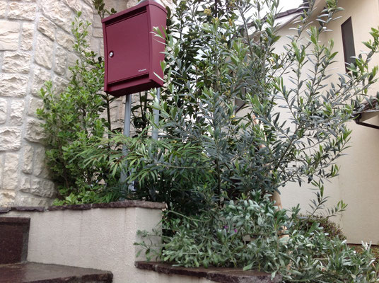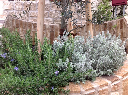 All year round interest in English garden style with Mahonia confusa, Euonymus, Laurus, Lavendula, Rosmarinus and Olea europaea.
